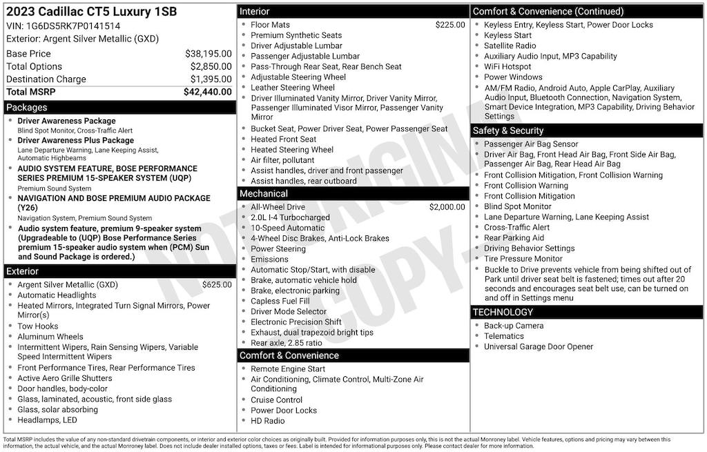 Certified. 2023 Cadillac CT5 Luxury Argent Silver Metallic AWD 10-Speed Automatic 2.0L I4 Turbocharged DOHC 16V LEV3-SULEV30 237hp
