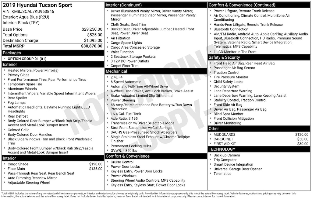 Designed to impress, the 2019 Hyundai Tucson Sport boasts a sleek, modern exterior with 19-inch alloy wheels, a power liftgate, and a sporty rear spoiler. Step inside and you'll be greeted by a well-appointed cabin with premium cloth seating and thoughtful storage solutions.