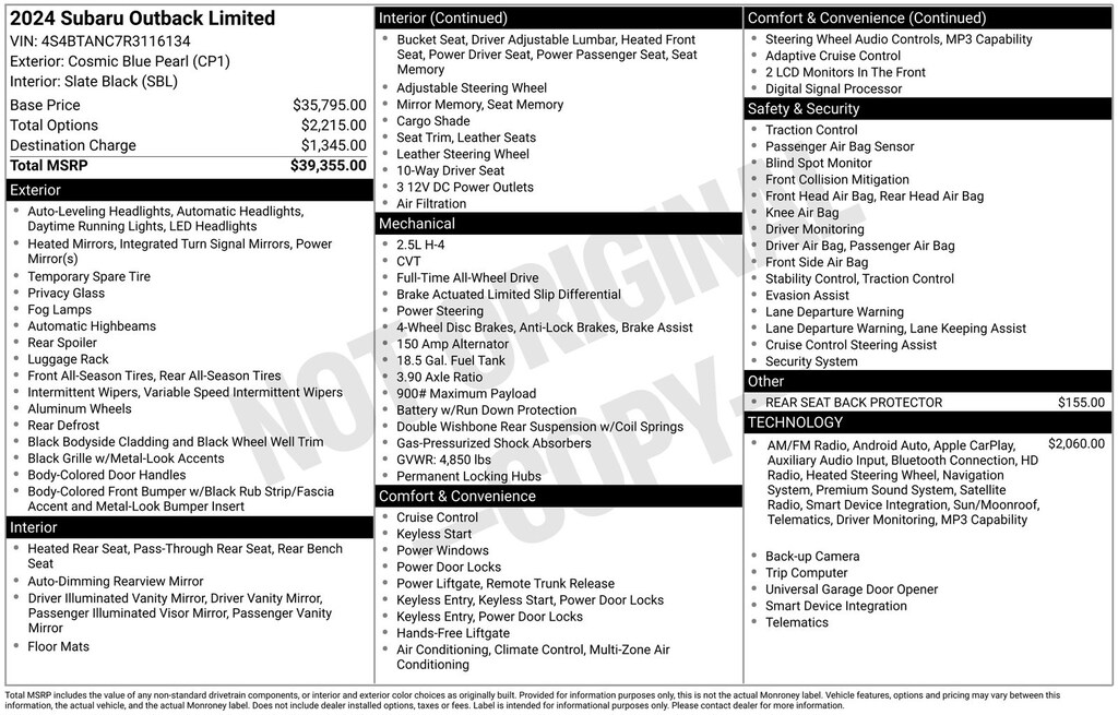 Certified. 2024 Subaru Outback Limited Cosmic Blue Pearl AWD CVT Lineartronic 2.5L 4-Cylinder DOHC 16V