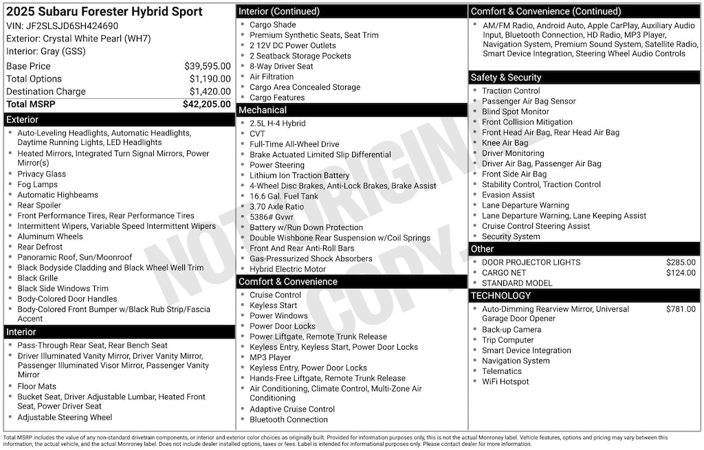 Boasting an impressive 35 MPGe in the city and 34 MPGe on the highway, this Forester Hybrid Sport delivers exceptional efficiency without compromising performance. The 2.5L 4-cylinder DOHC engine and Lineartronic CVT provide a seamless, responsive driving experience.